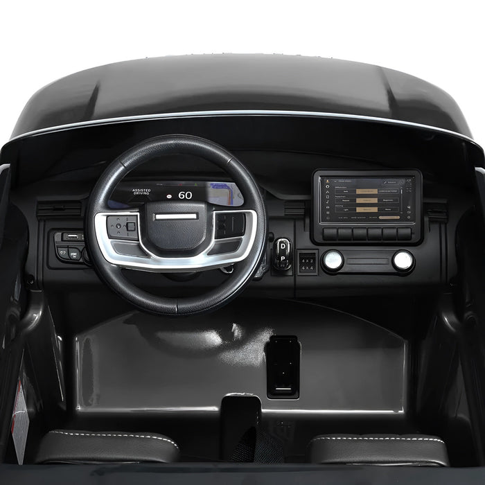 De Range Rover 24V auto voor kinderen is net een echte auto. Hij heeft een echte laklaag, deuren, een gordel, stoelen met lederen bekleding, een startknop, startgeluiden, een gaspedaal, een stuur, een schakelpook, een claxon, voor- en achterlichten, dashboardverlichting, een MP3/USB-aansluiting en verschillende muziekjes.