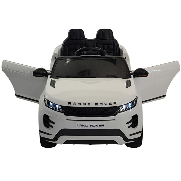 De witte Range Rover Evoque kinderauto heeft EVA banden (kunstrubber), vering, deuren, leren stoel, 5-puntsgordel, startsleutel, startgeluiden, claxon, muziek, voor- en achterlichten, claxon, bluetooth en een MP3/SD/USB aansluiting.